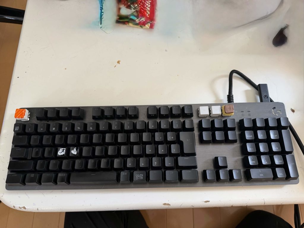 2020年ぐらいに買ったLogicool G512。有線で二股ケーブルとかいうバカ謎仕様やけどキーボード表面が金属プレートで覆われていて美しいからある程度チャタリングしていてもccchattttter等を活用して騙し騙し我慢して使っていたのだが、最近チャタリングどころかwinキーとかが押されっぱなしになってマトモに文字が打てなくなりイライラの限界に到達。