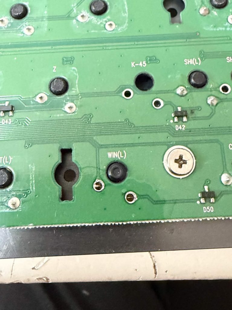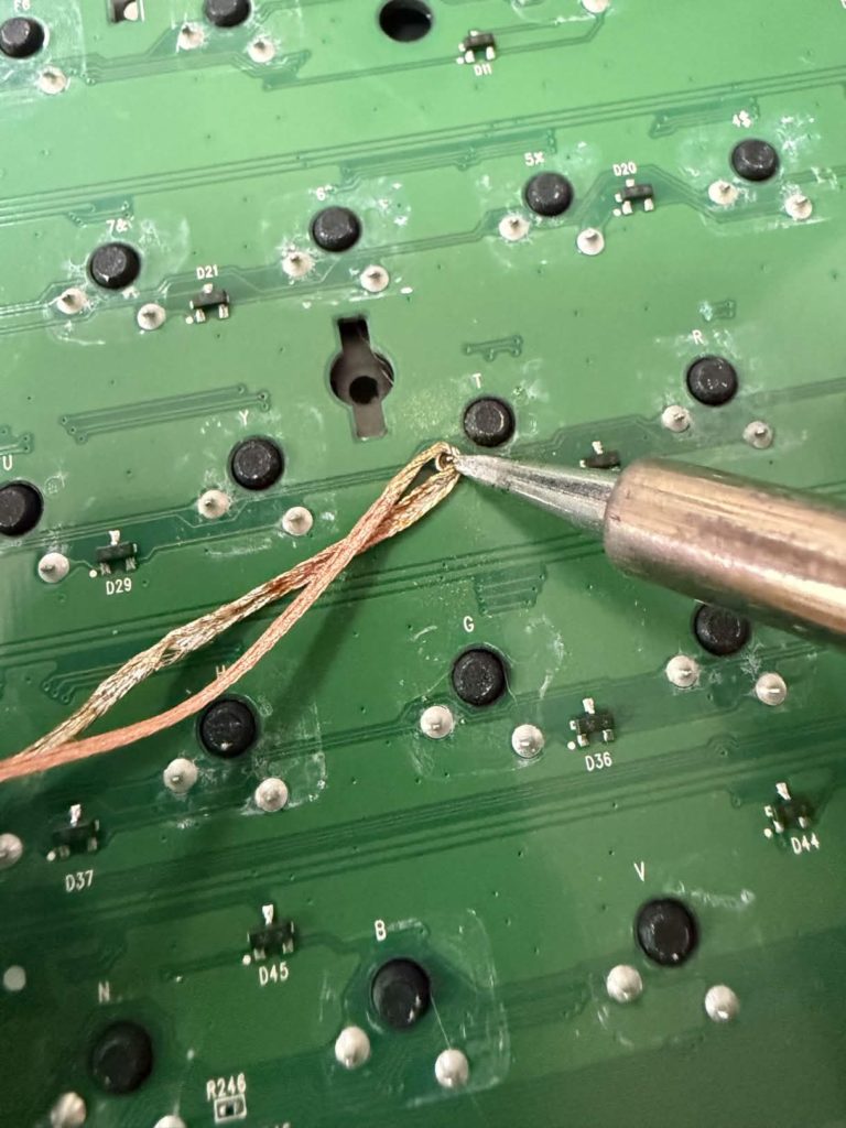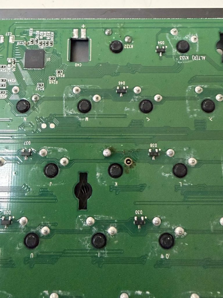キースイッチは、はんだで基盤と密接にくっついているため、はんだごてを使って取り除く必要がある。